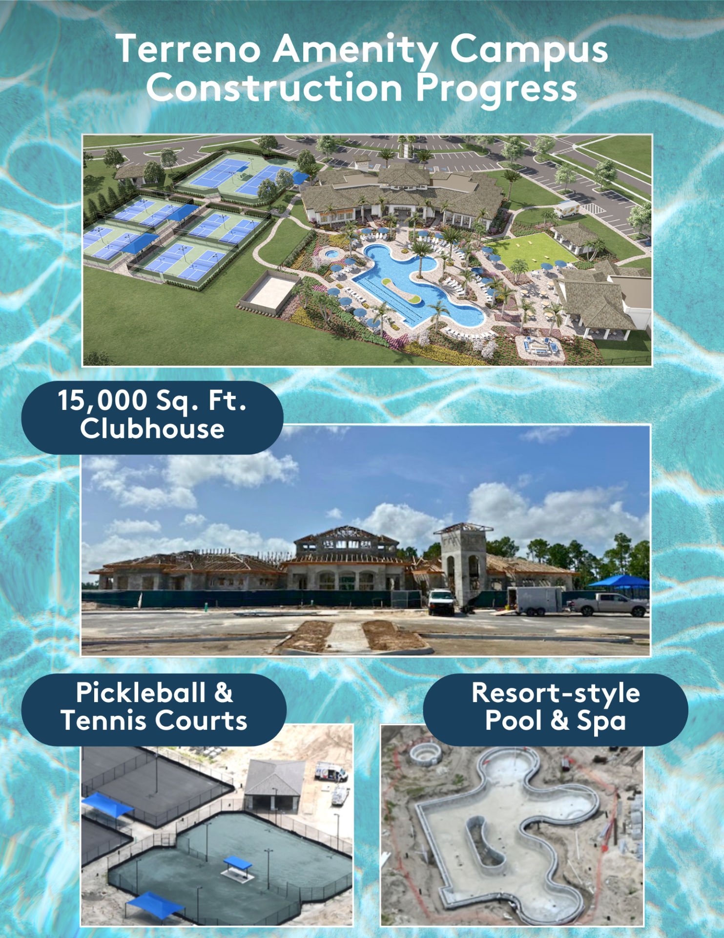 Progress on Terreno's Amenity Campus is moving quickly, with 8 Pickleball and 2 Tennis Courts set to open in Spring 2025, followed by our stunning community Clubhouse and resort-style pool, arriving in Summer 2025. Click below for a preview!